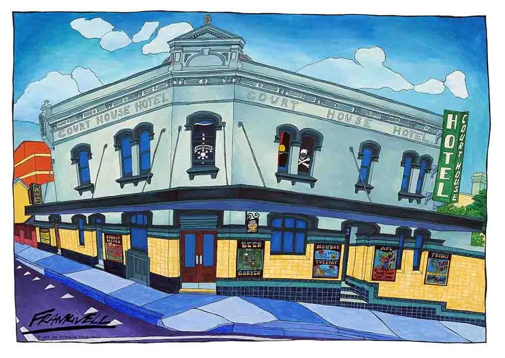 A heritage pub in Blacktown, The Royal Cricketers Arms dates back to 1881. Vibrant colours and bold ink line work to bring this historic pub to life. Highlighting the importance of historical preservation in our modern urban landscape.
